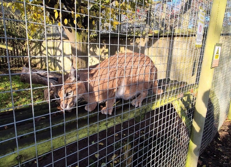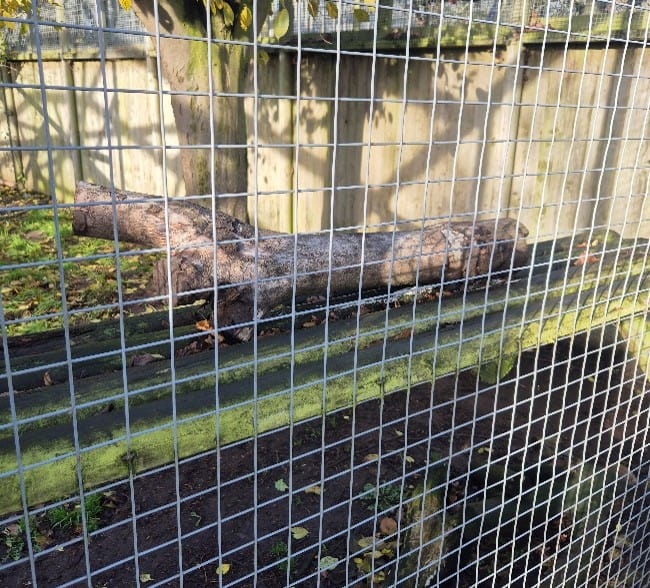 A shelf can also work if they are at a practical height. If the shelf is quite large so the cat can still face you and turn easily, then I make use of a trusty log! A well-selected, heavy log placed on the shelf can give you a temporary barrier to get the cat to practice laying side-on to the mesh. I have used this for our caracal, Maya.