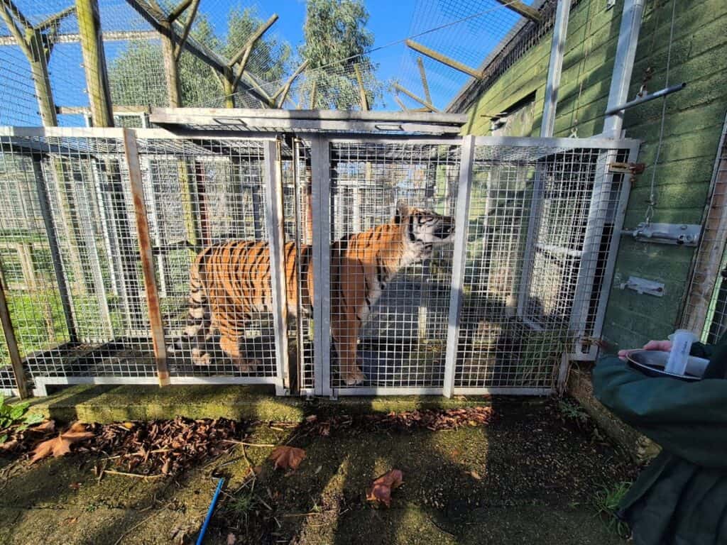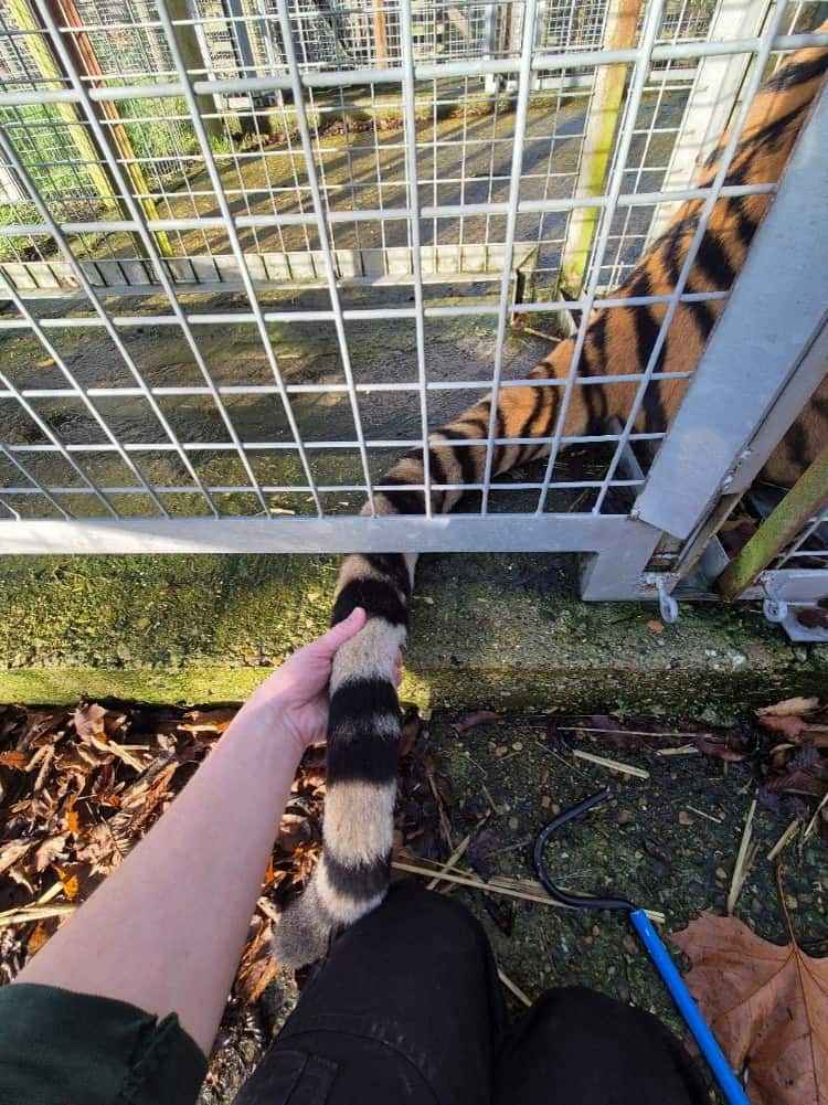 A corner of the enclosure will allow one person to feed the cat while the other keeper has access to the tail.