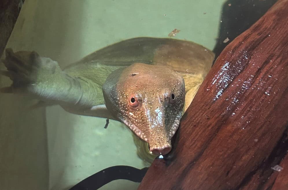 The softshell turtle is one of the spicier species of turtle that we house in the reptile house. ‘Softie’ (the loving and very imaginative nickname I have given our softshell) does not hesitate to try and bite your fingers if they come a little too close to her. I like to think this is because she’s a greedy gut and a finger can surprisingly look like a rat pup to a turtle who think she’s getting her favourite treats. She does however have a surprisingly long neck too so when we do need to handle her to get weights and perform health checks, we do have to watch our fingers as she can reach them even if they are at the very base of her shell. Although she does not have teeth, as is the case with all Chelonians, she does have a very hard jawbone area, not too dissimilar to that of a bird, which is why it is called a beak. This is powerful enough for her to feast on live invertebrates, crustaceans, fish and small mammals, so is definitely strong enough to draw blood from a daydreaming keeper.