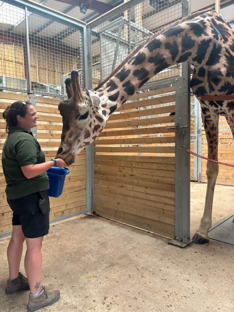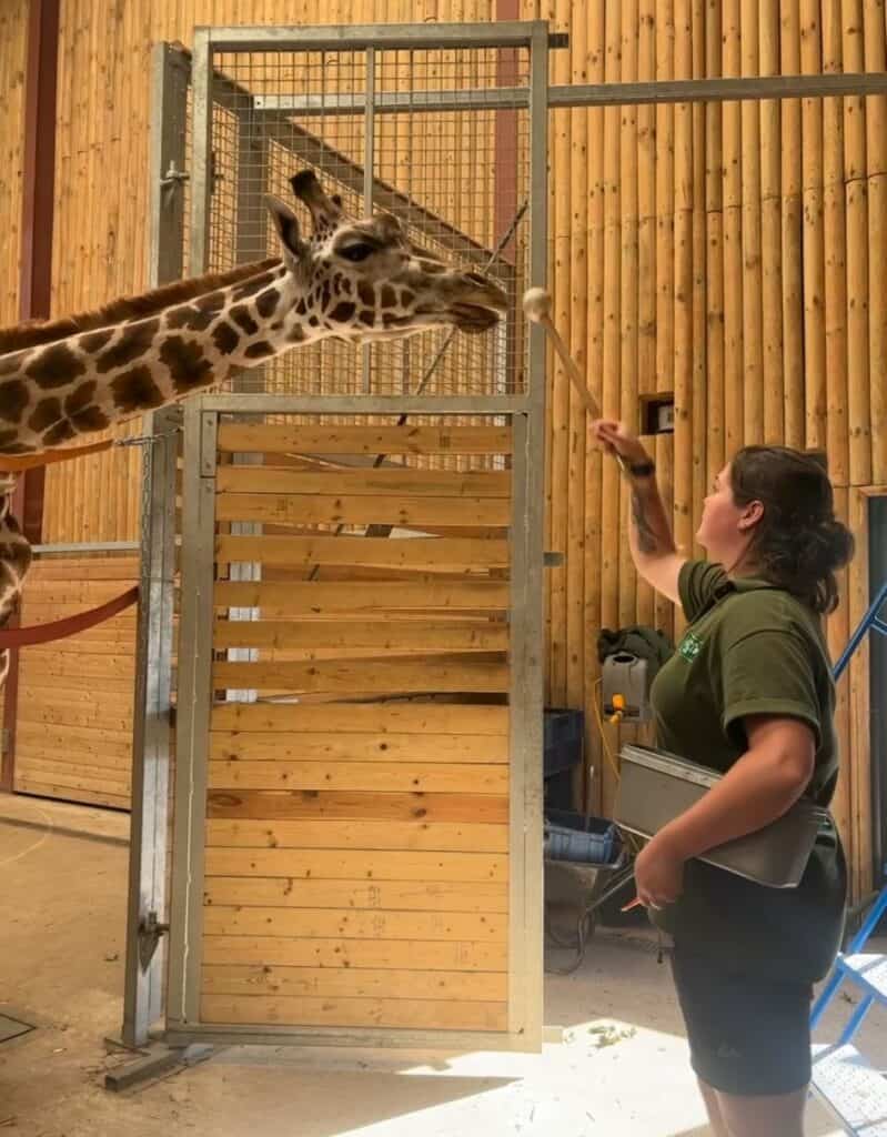 Animal training is my favourite part of the job, especially with the giraffes. It’s an essential part of their care; allowing us to provide them with more hands-on procedures to be proactive in diagnosing any issues that may occur with their health, in a voluntary way.