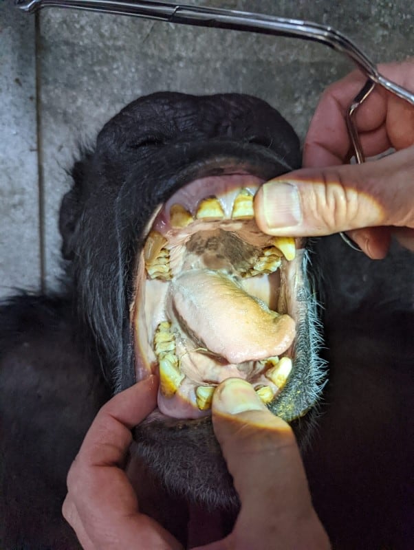 One of our chimps, Georgia, has been struggling with her movements recently due to reaching the grand old age of 46. She also suffered a fall from a beam in the garden a few weeks ago. It took her a few moments to get back up from said fall. So, the decision was made to sedate her so we could get a good look and a feel of what’s going on in her body.