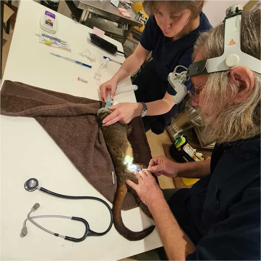 Once sedated, the night monkeys were given a microchip. this was done via a needle into the back of the neck, the same as your dog or cat. Plus, they were given the implant into their freshly shaved inner thigh via another needle.